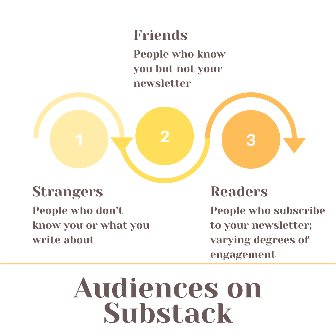 In this essay, I’ll explore three key types of audiences on Substack—Strangers, Friends and Readers—and offer publishing strategies for writing Notes, headlines and email headers/footers that take each group into consideration.