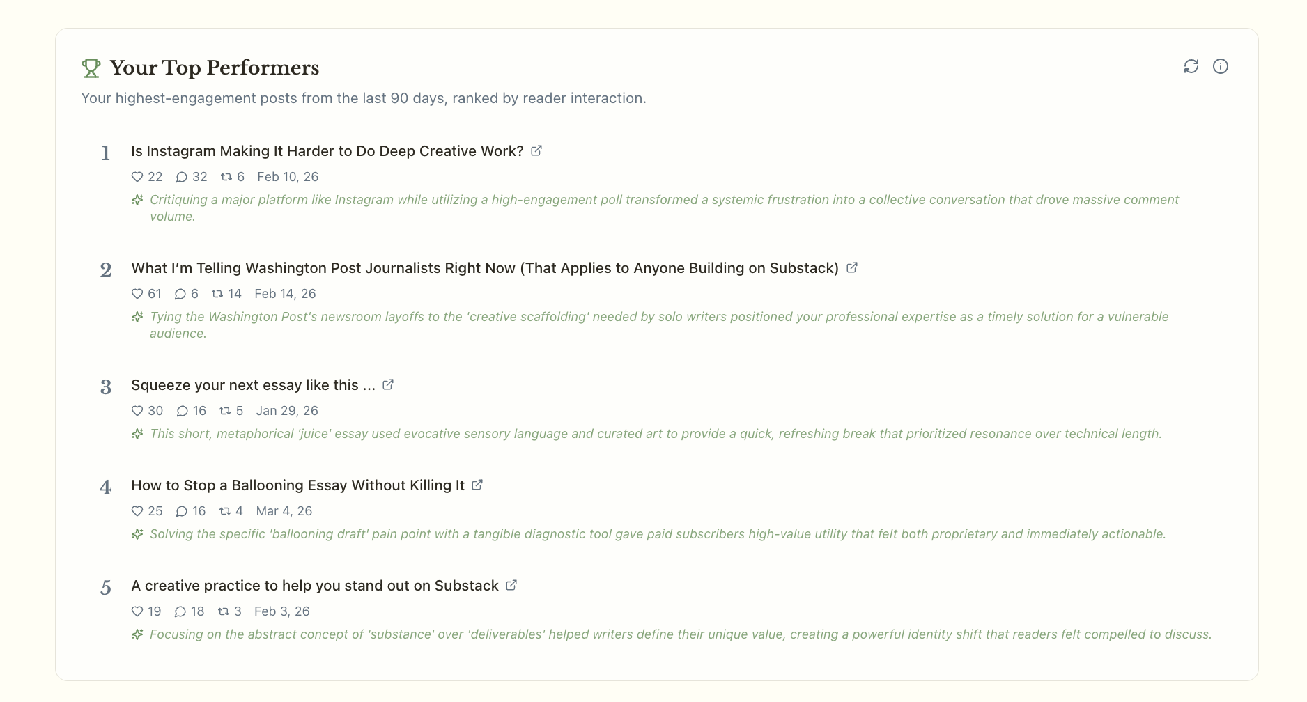 You can see which posts are doing real work — not just getting opened, but increasing engagement, attracting subscribers and supporting your overall publication experience.