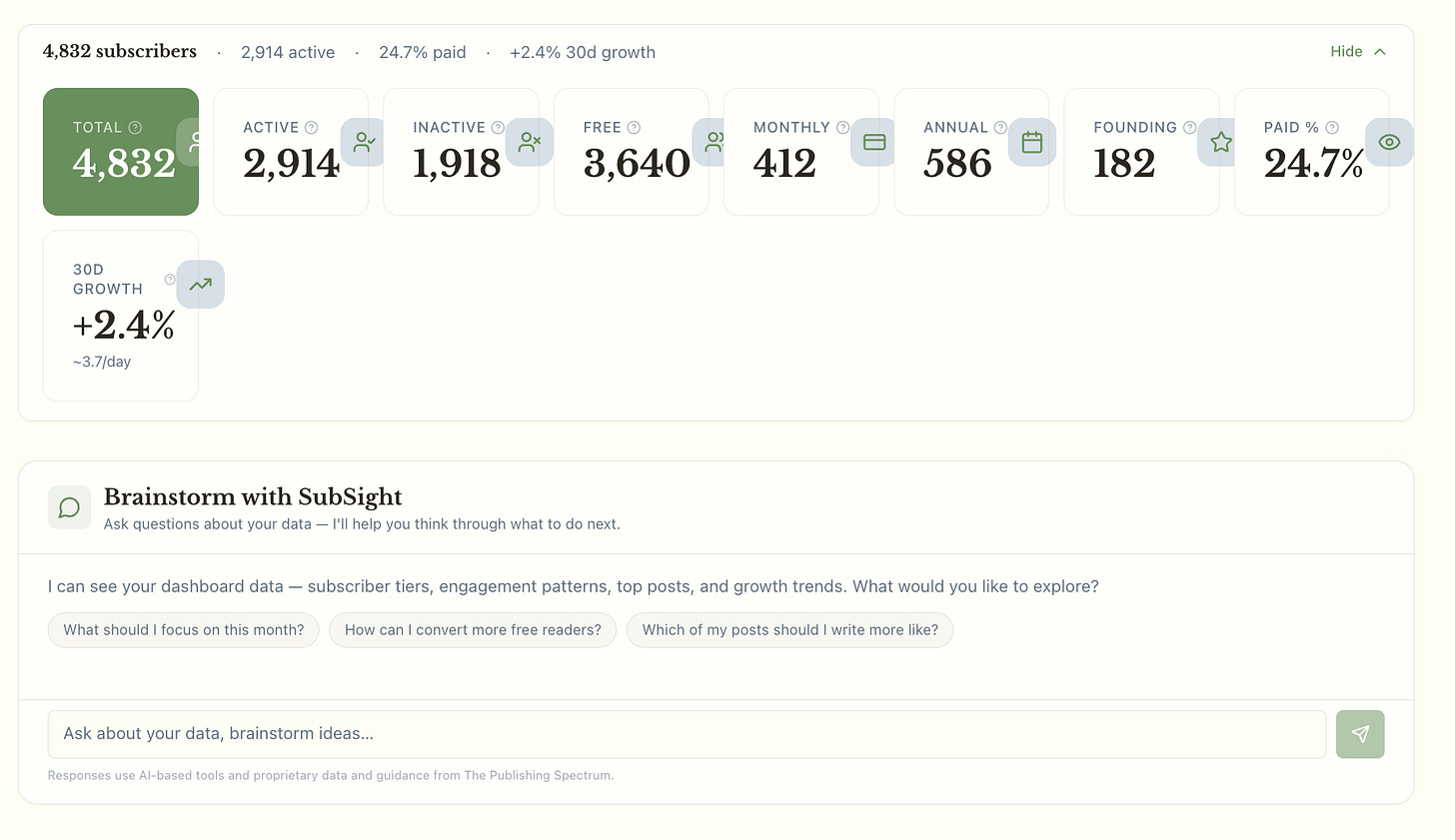 I’ve also built a brainstorming companion into SubSight — trained on my own frameworks, nearly 20 years of editing and the last four years of pattern tracking inside this great Substack publishing experiment.